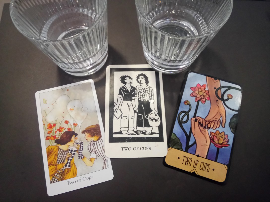 Cette carte, ma parole, c’est celle du grand amour. On est biberonné-e-s aux contes de fées à la sauce Disney. C’est vrai qu’ils reposent sur des mythes sexistes, cishétéronormés, racistes, âgistes, classistes et fervemment monogames. Mais, on a beau le savoir, ça nous trotte souvent dans un coin de l’esprit. Rassure-toi, le deux de coupes n’est pas le grand amour version le pervers qui poursuit l’héroïne pendant quatre saisons parce que, consentement ou pas, c’est elle, la seule et l’unique. C’est pas le big love version gamin-e-s, maison et labrador. C’est l’amour authentique tel que toi, tu le définis, pour la life toute entière ou pour une nuit, en mode exclusif, asexuel, aromantique ou polyamoureux. La forme importe peu.