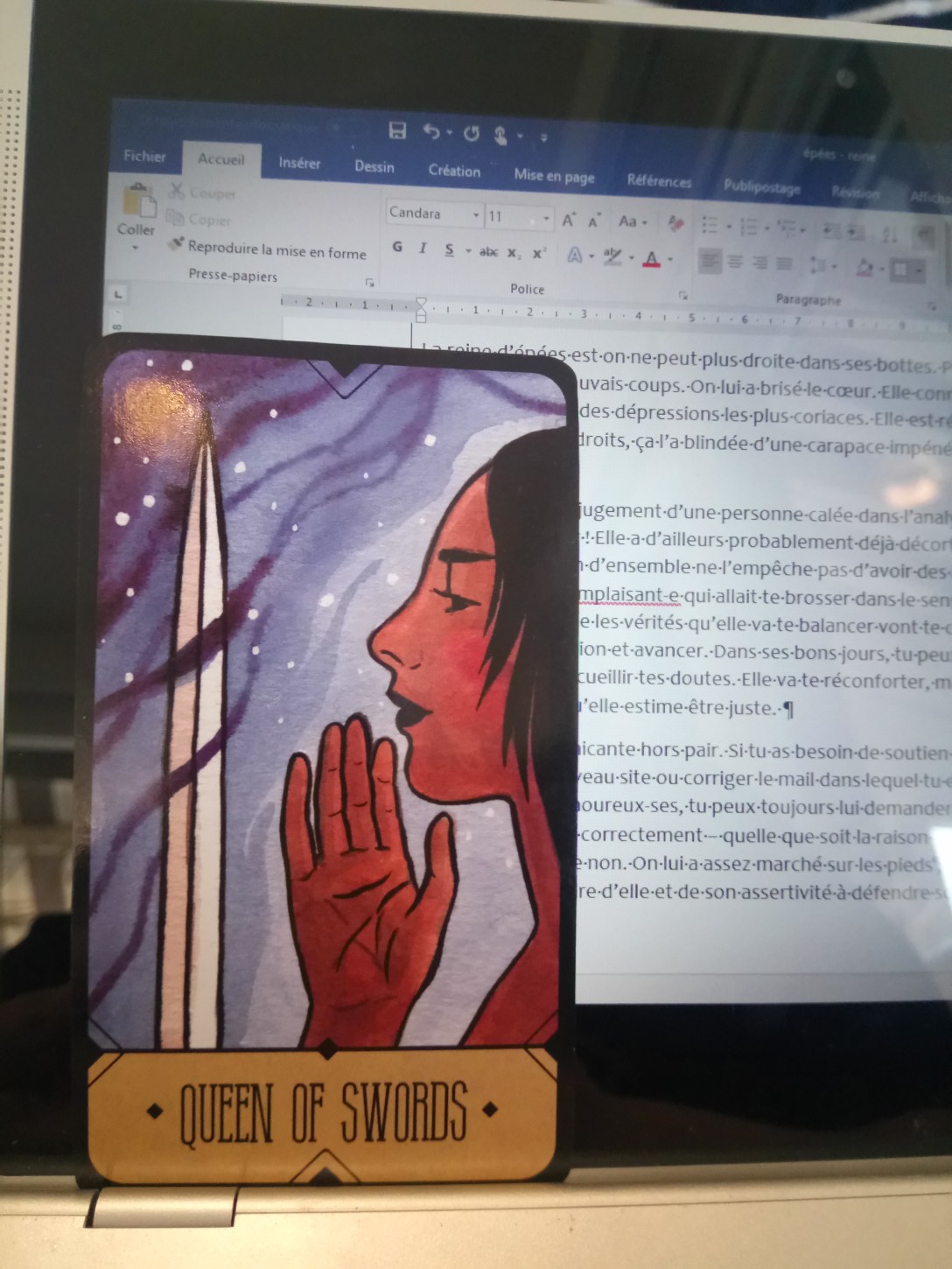 La reine d’épées est on ne peut plus droite dans ses bottes. Peut-être un peu trop ? Elle a l’habitude des mauvais coups. On lui a brisé le cœur. Elle connaît l’abandon et les galères. Elle est revenue cent fois des dépressions les plus coriaces. Elle est résiliente. Elle en a morflé, ça l’a renforcée. Par endroits, ça l’a blindée d’une carapace impénétrable. Au moins, elle se sent en sécurité.