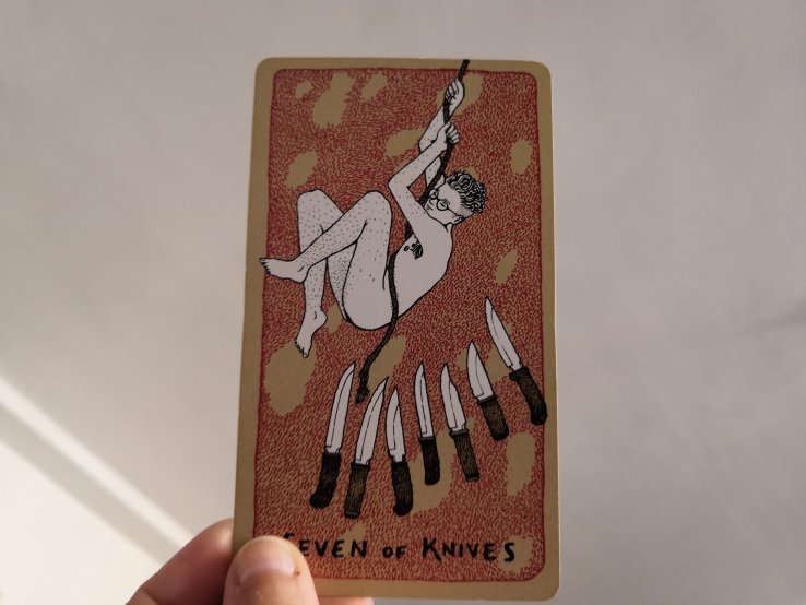 Je débarquai peu après à Bruxelles pour suivre les cours à l’unif pendant la semaine. J’ai pris rendez-vous chez un thérapeute conseillé par le psychiatre. Je lui ai révélé mon secret. Mais pas au reste du monde. Oh, non, jamais. Mon 7 d’épées : mon parcours de mutilation inavouable, péché gardé secret, ces moments de transe aussi jouissifs que douloureux, où mon corps existait. Mon corps intouchable. Résolument tenu à distance. Ce corps qui ne recevait aucun câlin, aucune marque d’affection, aucun égard d’aucune sorte. Mon secret si précieux : il ressentait. Il souffrait. Je pouvais l’atteindre. Je pouvais en faire ce que je voulais. Je pouvais le haïr et – je le découvrirai plus tard – le chérir en refusant l’assignation à la vraie féminité, celle dont on prétend que la chevelure est le symbole, celle qui n’est éclatante que dans un corps lisse. La féminité désirable. La féminité qui ne rebute pas les hommes. Le versant positif de mon secret, c’est que je n’apprendrai jamais cette féminité.