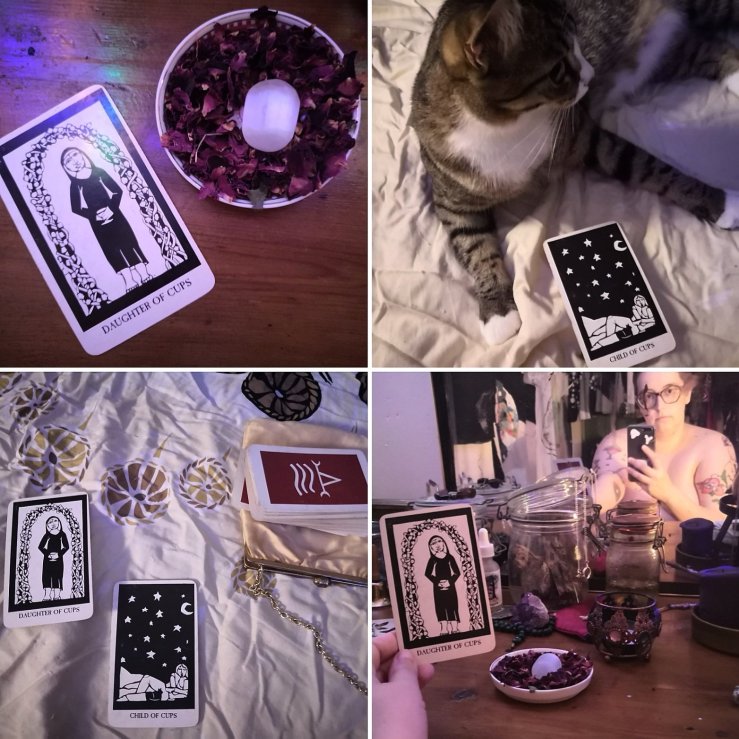 Maintenir un autel modifie mon rapport à la propreté et au rangement. Ma spiritualité de sorcière (et le partage d’un appartement avec un chaton) m’ouvre à la purification, aux « énergies » et à leur circulation, et à l’impact de tout ça. Merci au Thea’s tarot ! J’ai tiré la fille (reine) de coupes à ce sujet. Fort à propos 🙂