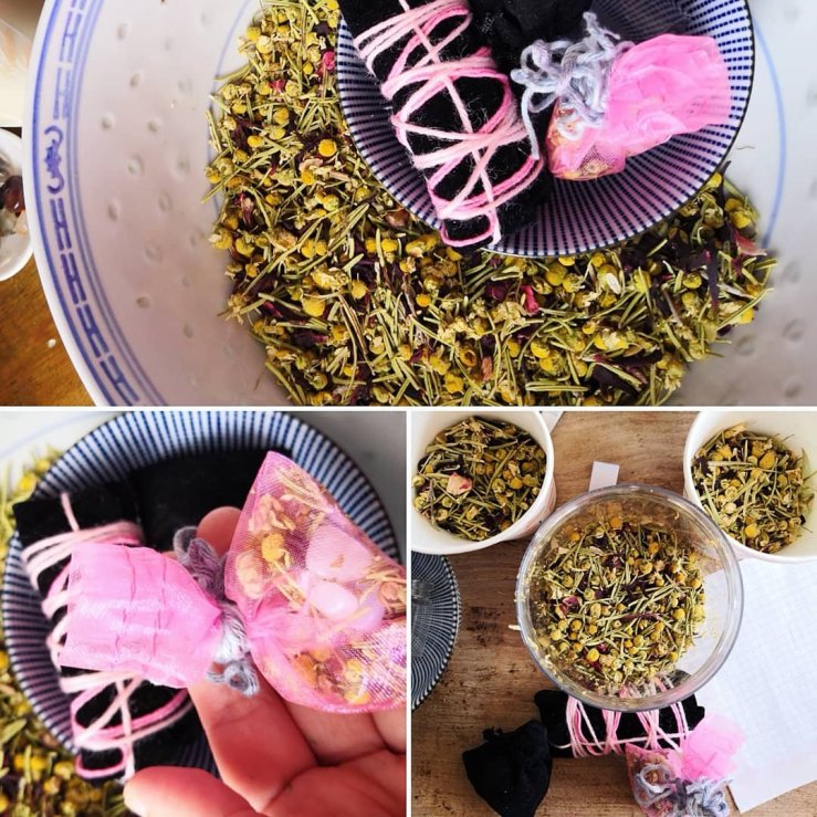 Selon les sachets, en fonction des besoins de chacune, j’ai travaillé avec les herbes suivantes: graines de guimauve, camomille, romarin, hibiscus, clou de girofle (en partie des choses que j’ai récoltées et faites sécher moi-même parce que je voulais personnaliser au maximum). Et les pierres suivantes: agate blue lace, agate mousse, quartz rose, labradorite. Voilà qui sera parfait sous l’oreiller de mes amies. ☺️
