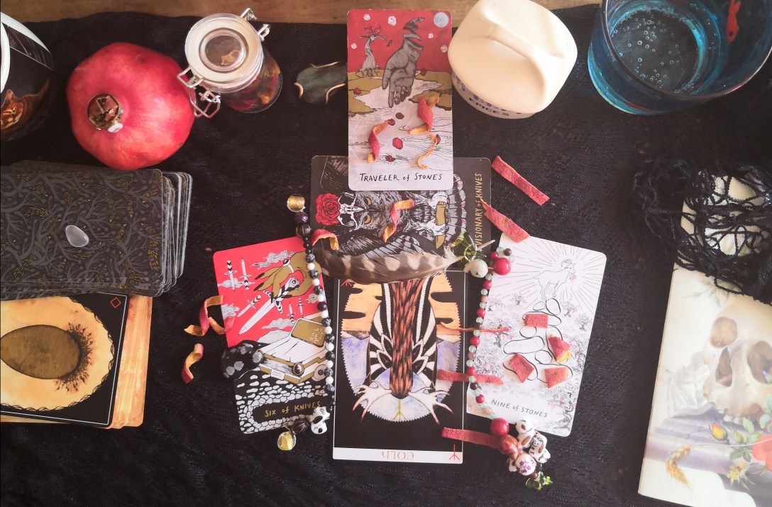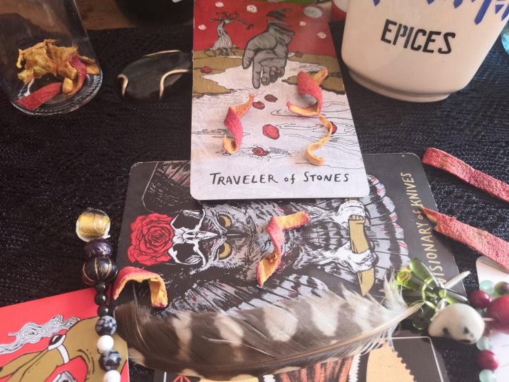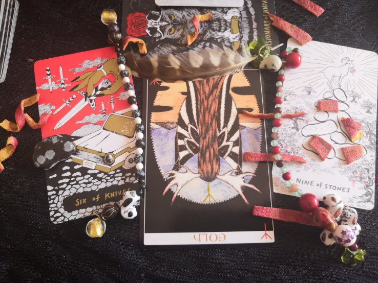 Se promène-t-on sur le fil de nos envies mitigées sans se risquer à explorer? Ne devrait-on pas partir dans un voyage dans l’inconnu de l’autre monde (6 de couteaux), comme le fait Perséphone l’automne venu, tandis que, parallèlement, dans le confort de ce qu’on connaît bien (9 de pentacles), tangible, concret, on déploierait nos compétences pour agir pour la transformation sociale?