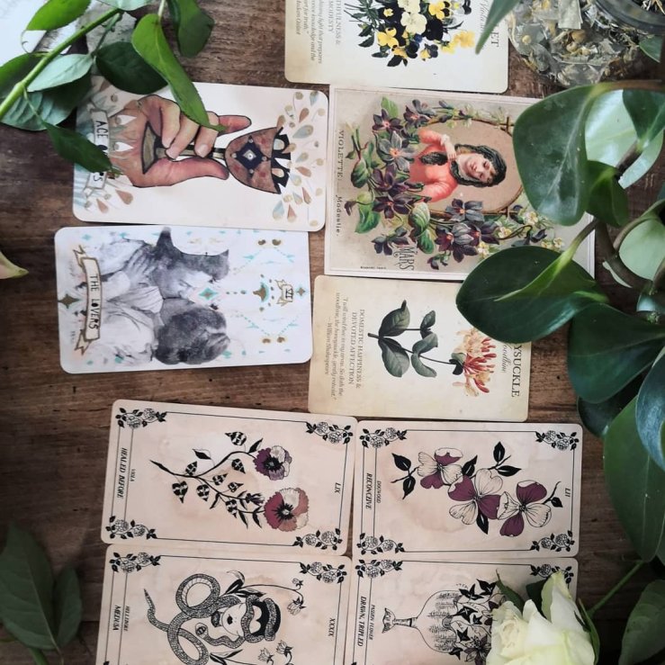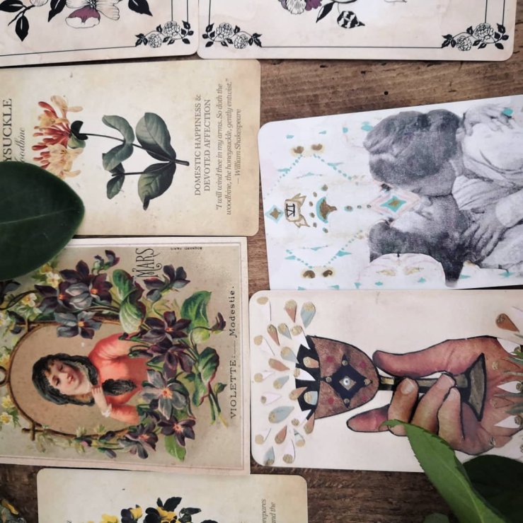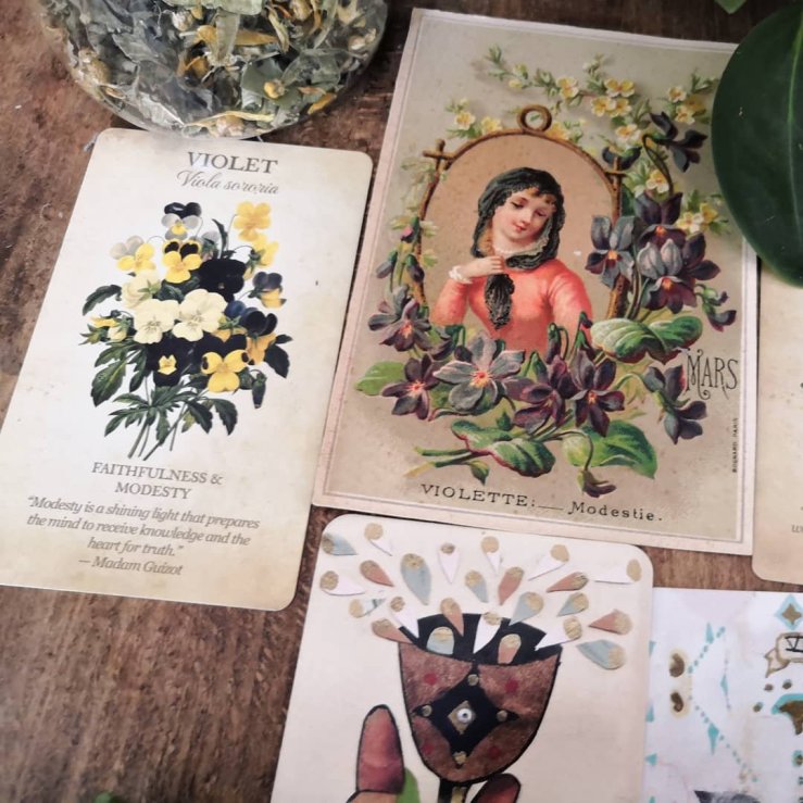 Tirage collectif du dimanche. Autour de la carte ancienne « Mars » d’une série de cartes postales de la fin du 19e siècle sur le langage des fleurs et les mois de l’année. J’ai sorti d’autres oracles à fleurs et les violettes/viola/pensées sont sorties dans tous les jeux. On va les prendre sérieusement…