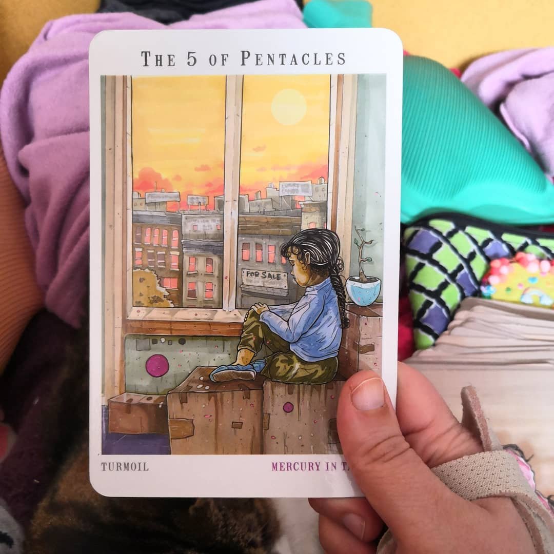5 de pentacles. Pas de chauffage jusqu’à nouvel ordre. Tout est à remplacer. Nouvel ordre, c’est sans doute pas avant l’hiver prochain. Si on nous vire pas avant. L’épée de Damoclès suspendue au-dessus de nos têtes depuis juin dernier ne tient plus qu’à un fil. J’arrive même plus à angoisser. L’électricité qui nous a lâchées aussi, ça a sonné le glas de nos espoirs. Ça va, ça vient, une phase pète, une autre revient. Tant que t’allumes rien qui a une résistance. Bref, t’allumes rien. J’ai la crève, je suis au-delà de l’angoisse.Ma vie est entre les mains du gestionnaire privé, une des plus grosses boîtes de gestion de lieux vides en occupation temporaire d’Europe et entre celles du « nouveau propriétaire », un truc public, le genre qui navigue entre « logements sociaux » et gentrification. Ma vie est entre les mains du médecin-conseil de la mutuelle que je vois tout à l’heure. J’arrive pas à angoisser en étant à ce point dépossédée de mon existence.