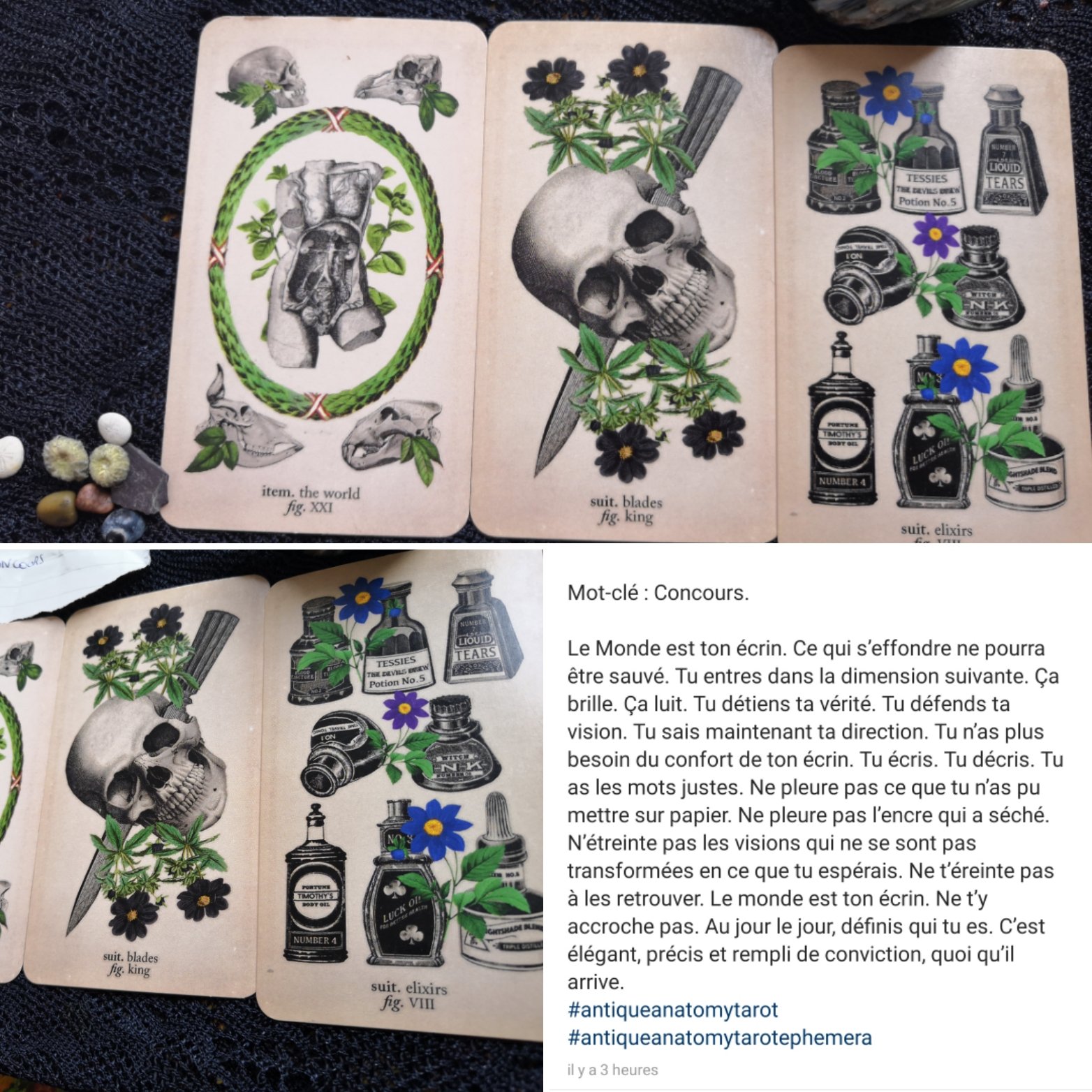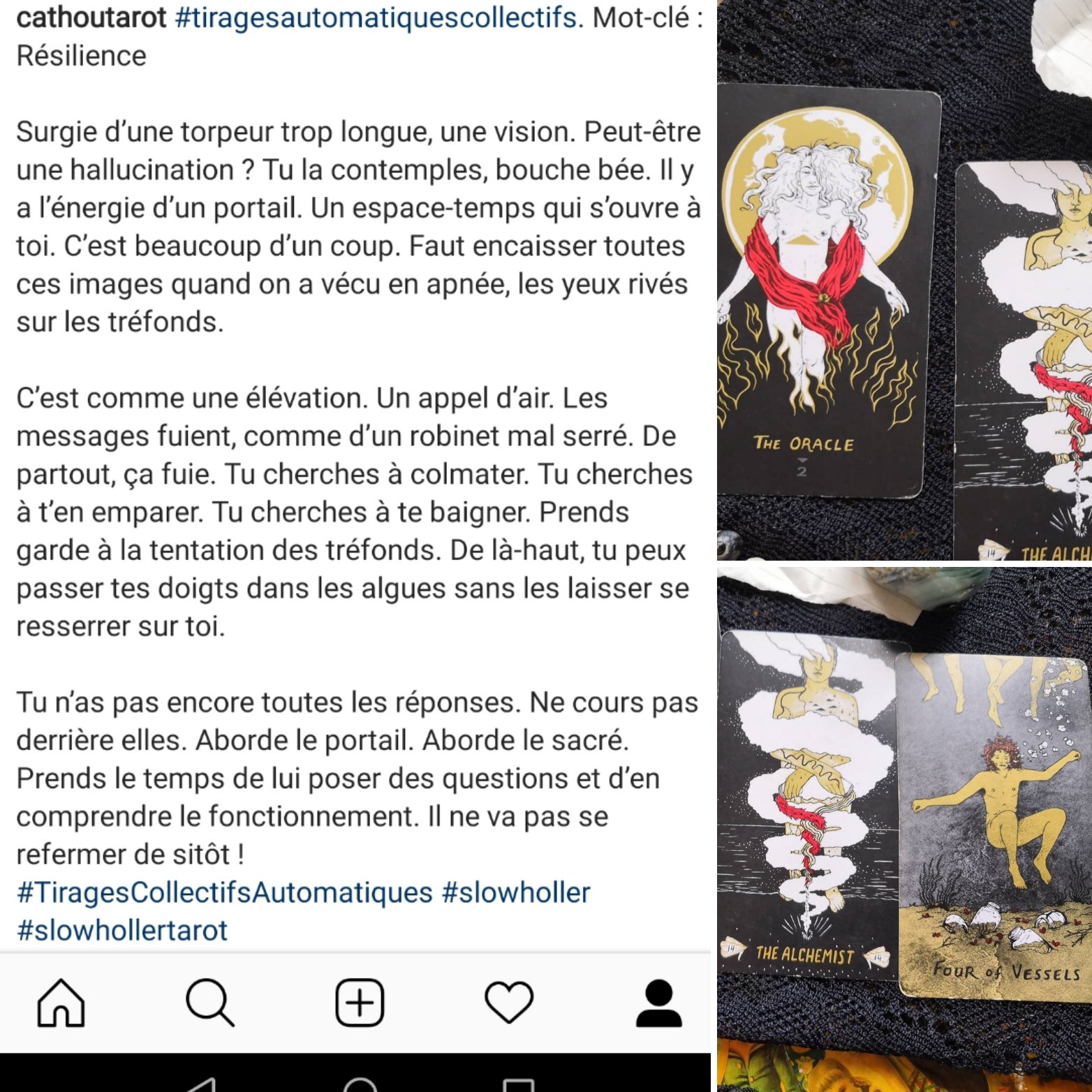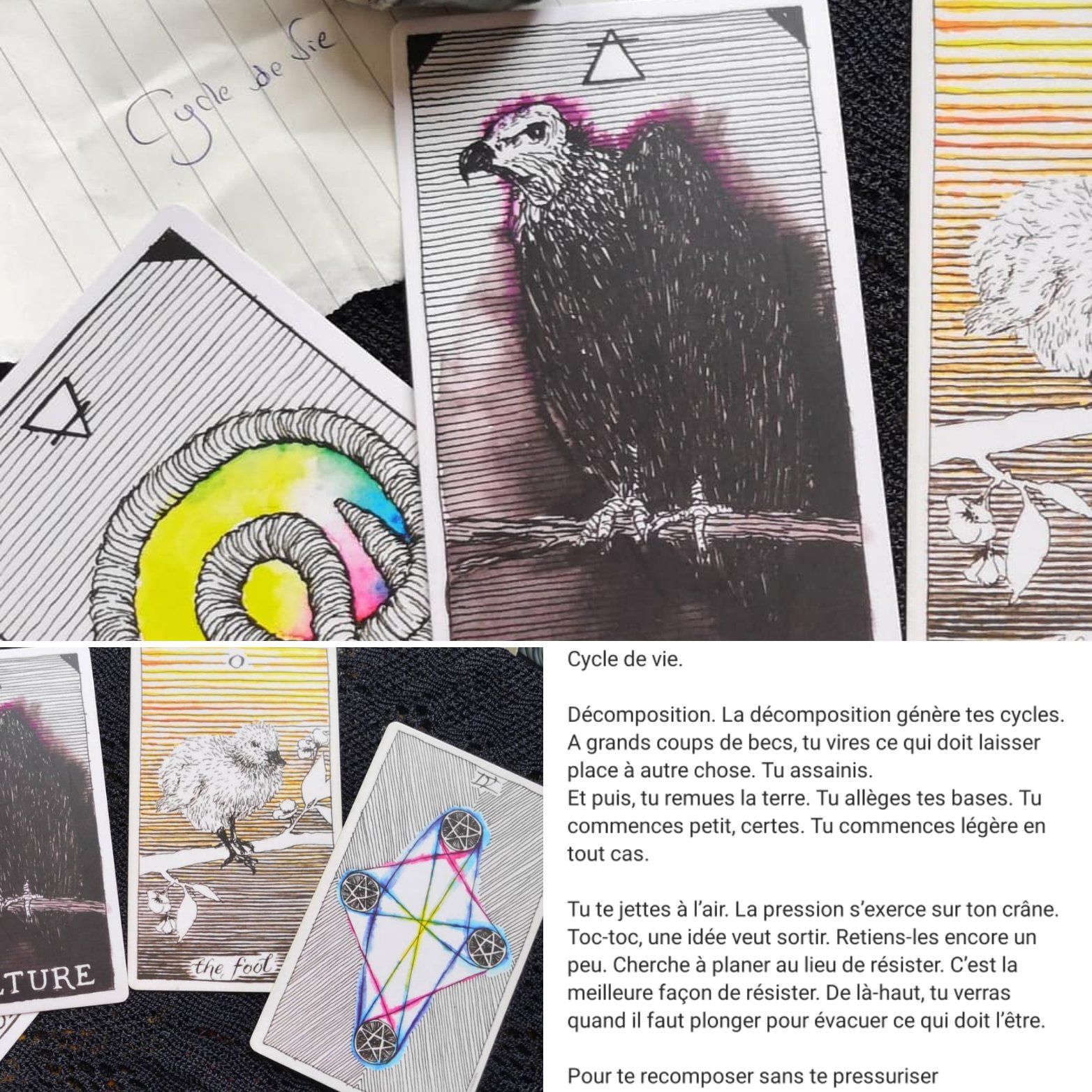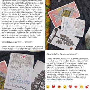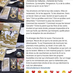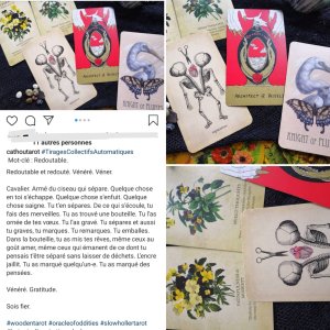 J’ai proposé un petit jeu sur instagram ce weekend: réaliser de rapides tirages en « écriture libre » pour les personnes qui le demandaient, en espérant que leurs messages en touchent aussi d’autres. Il s’agit d’une technique de tirage et d’interprétation pour laquelle je n’utilise pas de positions fixes pour les cartes. Je pioche, j’écris ce qui vient en essayant de ne pas intellectualiser, ne pas réfléchir (ce n’est pas tout à fait possible à 100% dans ce cas). Je capte les messages, je les tape sur le clavier. Et le tour est joué.