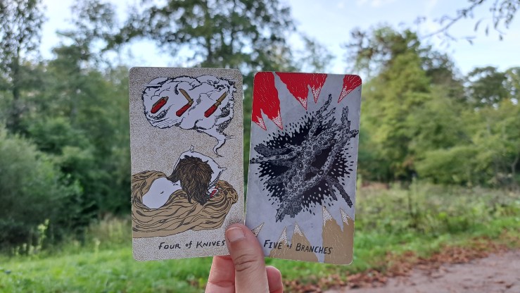 4 de couteaux et 5 de branches (Slow Holler Tarot)