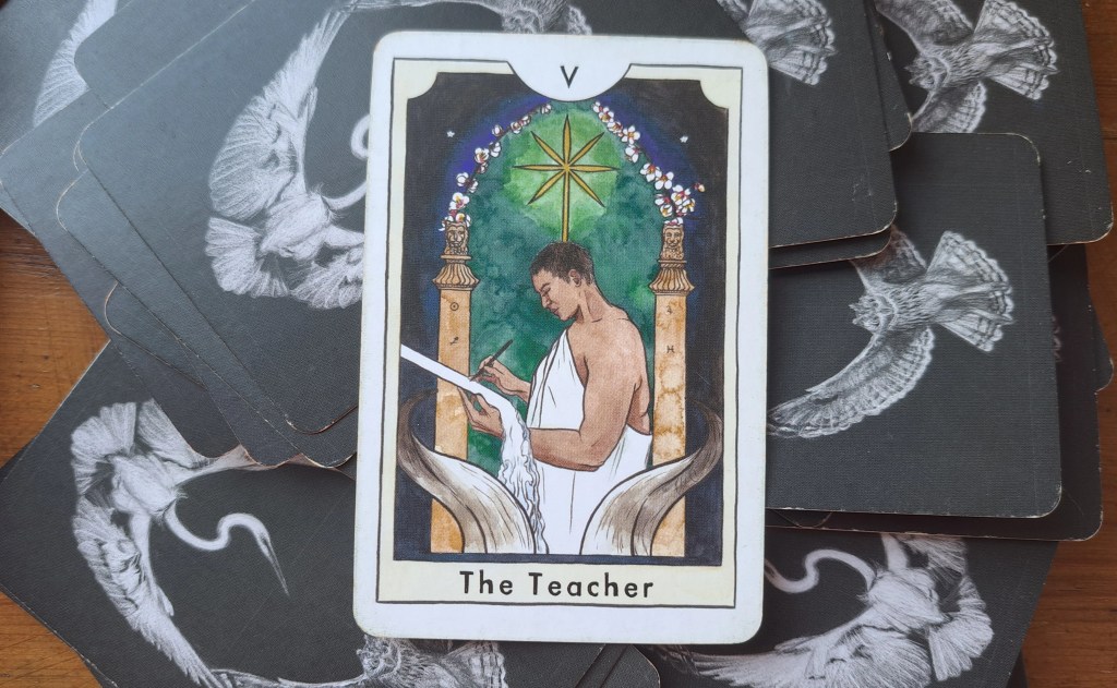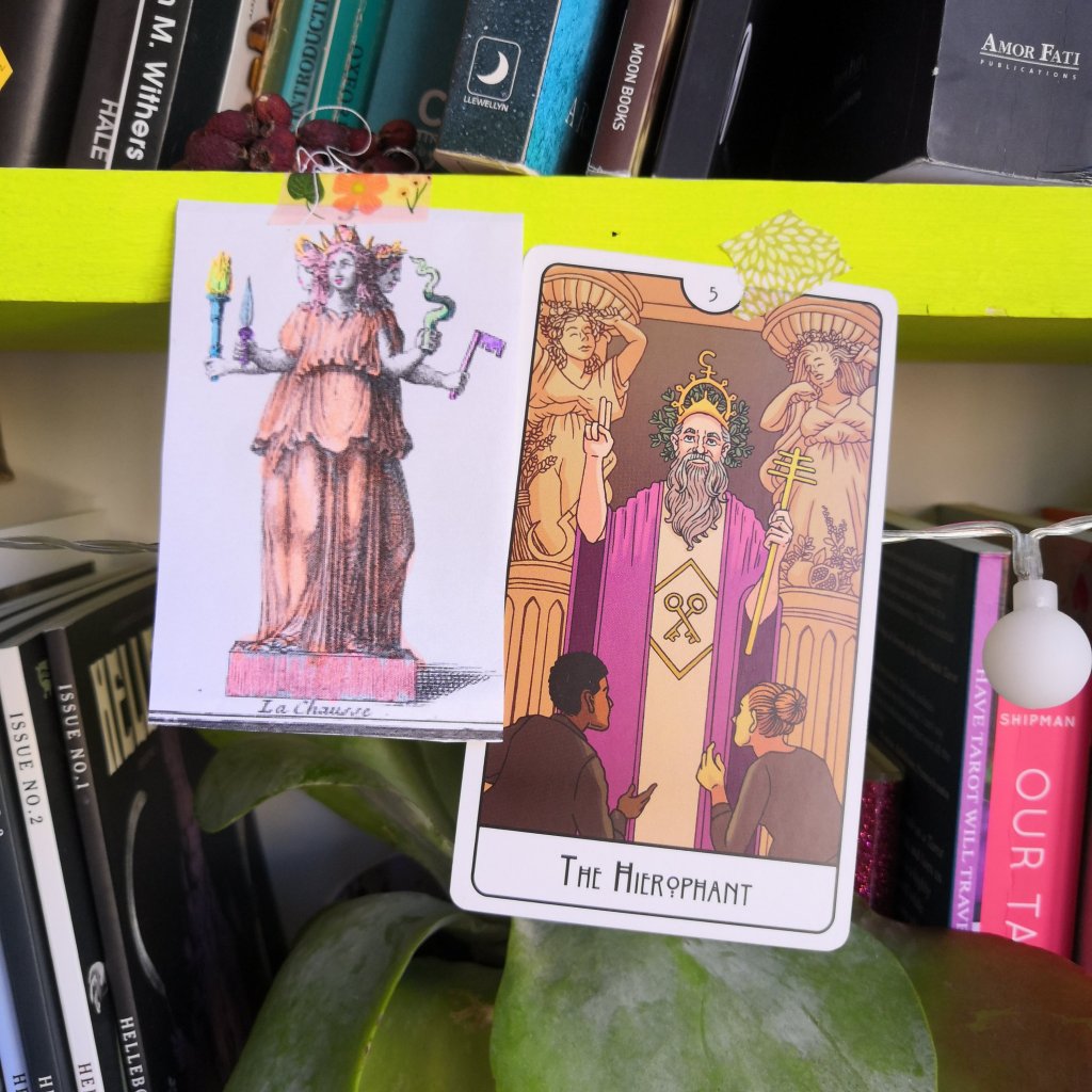 L’Hiérophante du tarot Smith-Waite fait référence aux prêtres d’Eleusis, lieu de culte à Déméter et Perséphone. Iels assuraient la transmission des mystères de la vie et de la mort. Etymologiquement, cette fonction rassemble le sacré et la découverte. A-t-on besoin d’un.e prêtre.sse pour qu’opère cette rencontre? Dans certains jeux, les mystai, les initié.es s’agenouillent devant l’Hiérophante, garant du secret des Mystères d’Eleusis. Et toi, que fais-tu?