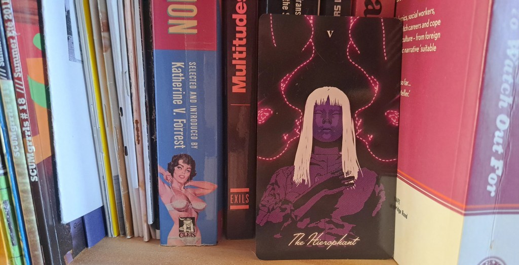 On me dit souvent que je « décomplexe le tarot ». Qu’est-ce que ça veut dire? Sans doute une référence à la pression autour de l’apprentissage du tarot, dans les milieux francophones en particulier: il faudrait bien connaître toutes les cartes avant de pouvoir les tirer, il faudrait les craindre, les vénérer, arriver avec la déférence qui serait due à cet outil « ancestral ». Même si la multiplication des sources a heureusement ( !) brouillé ce « gatekeeping » du tarot (c’est-à-dire le gardiennage élitiste et le contrôle à l’entrée de la discipline), beaucoup d’entre nous intègrent ces peurs. On ne se sent pas à la hauteur. On a besoin qu’on nous dise comment faire. On pense qu’il y a celleux qui savent et les autres. On oublie les échanges et les interactions. On culpabilise.