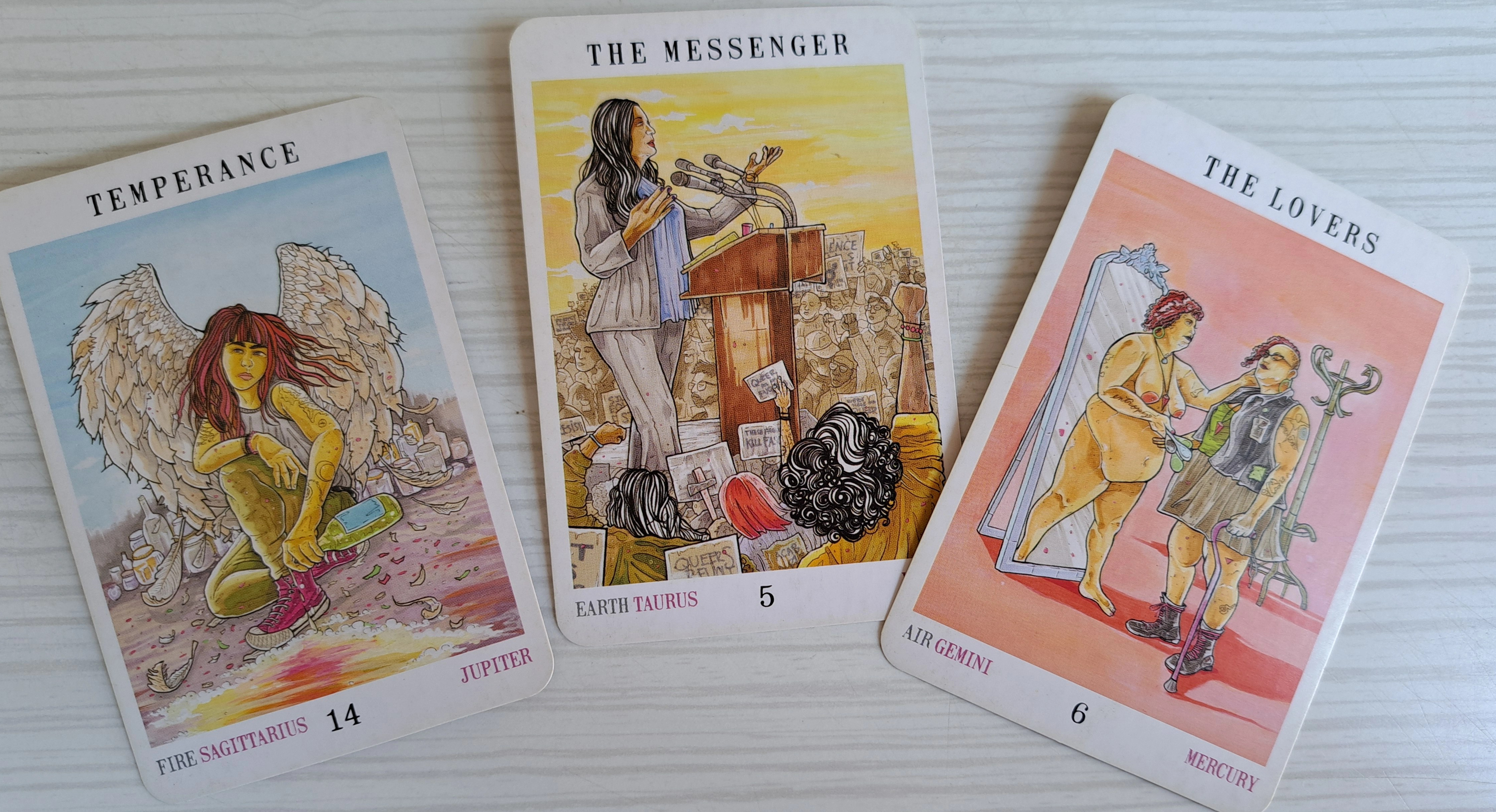 A l’issue de l’atelier, l’espace sera ouvert comme une bibliothèque où tenir entre les mains et tester des tarots pas communs, féministes et queers. Et pourquoi pas pour se (faire) tirer les cartes?