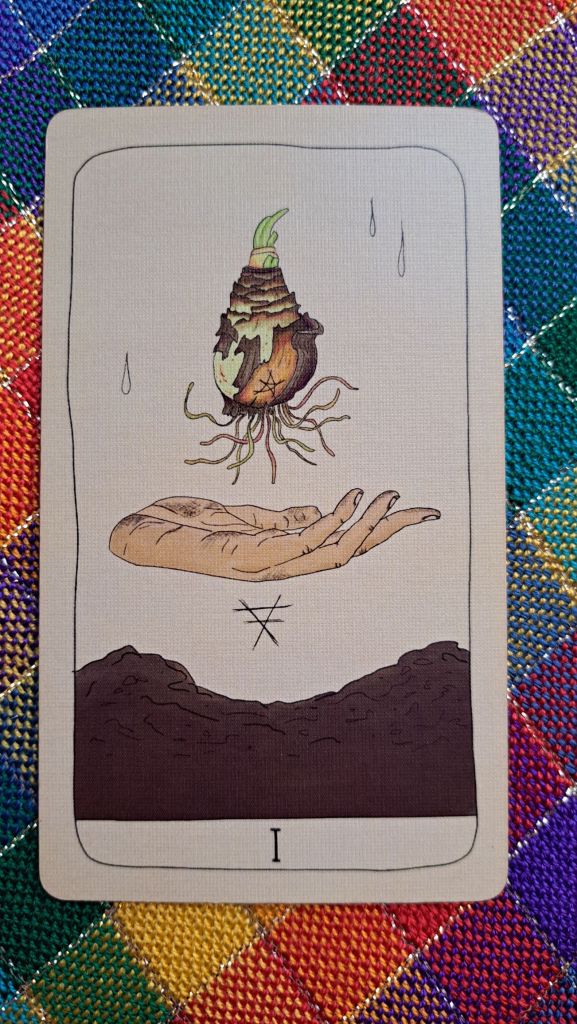 As de pentacles. Viens te planter dans la terre. Ou pose un bulbe de jacinthe sur ton appui de fenêtre: un rappel de ta capacité à fleurir, à t’épanouir, même au cœur de l’hiver, même lorsque tu te crois éteinte. Rappel que la dormance touche à sa fin.