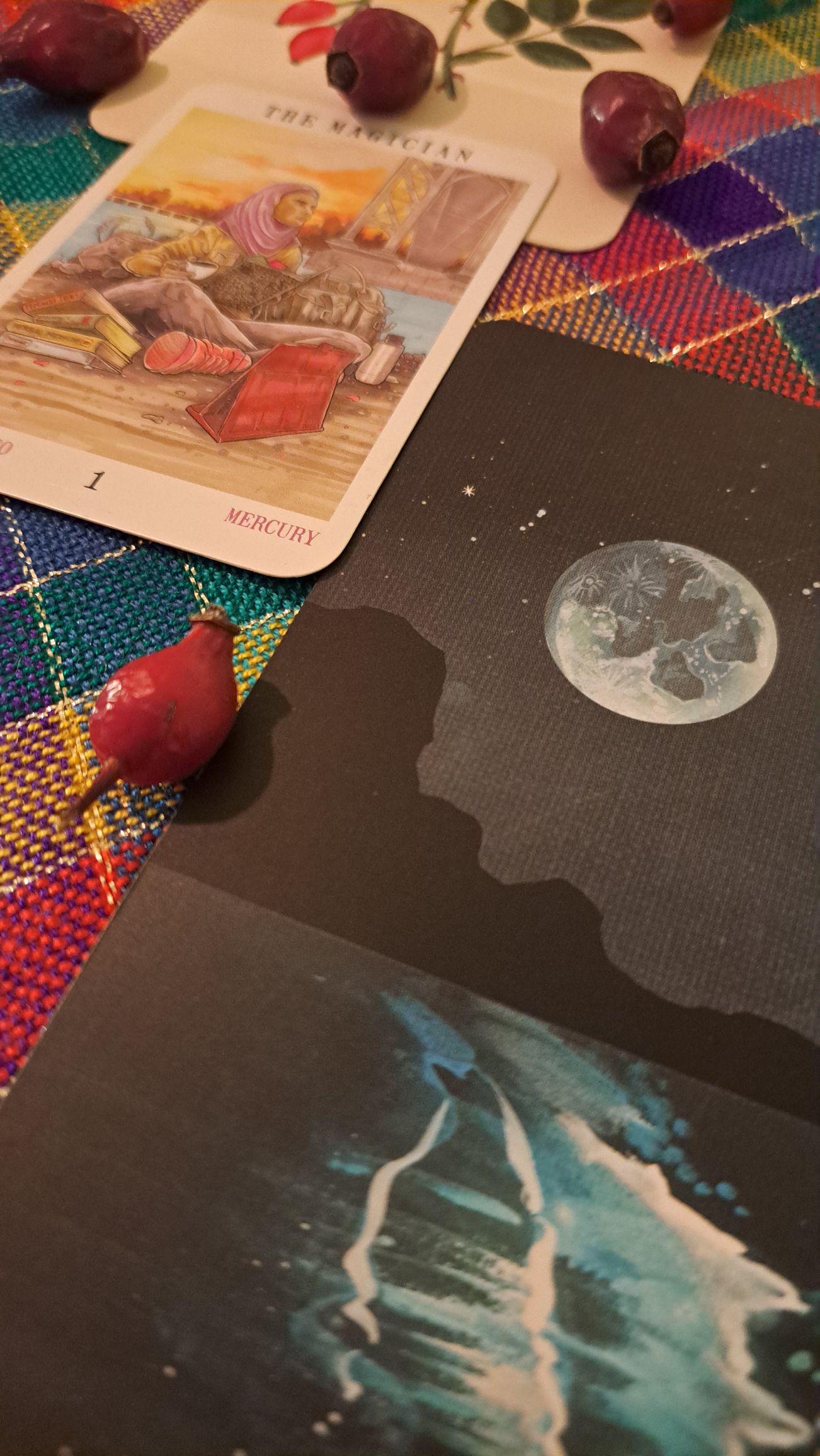 Decks: next world tarot (pocket) & how to be a moonflower deck (& le wild alchemy lab pour l’illustration de rose des chiens et de ses cynorrhodons)