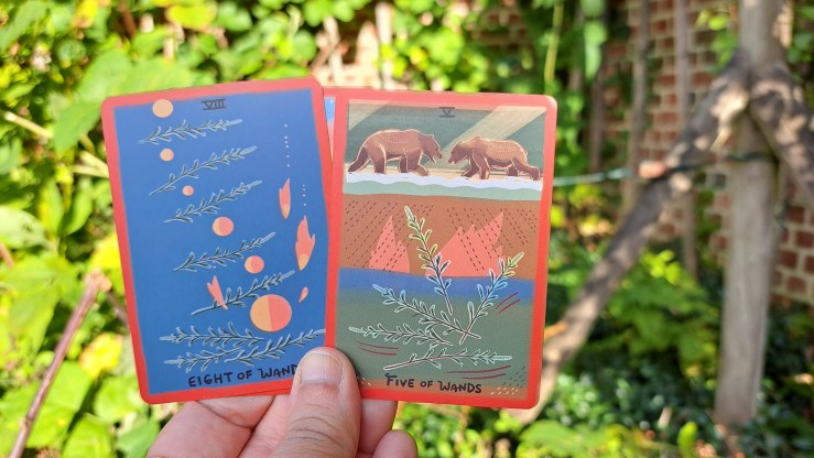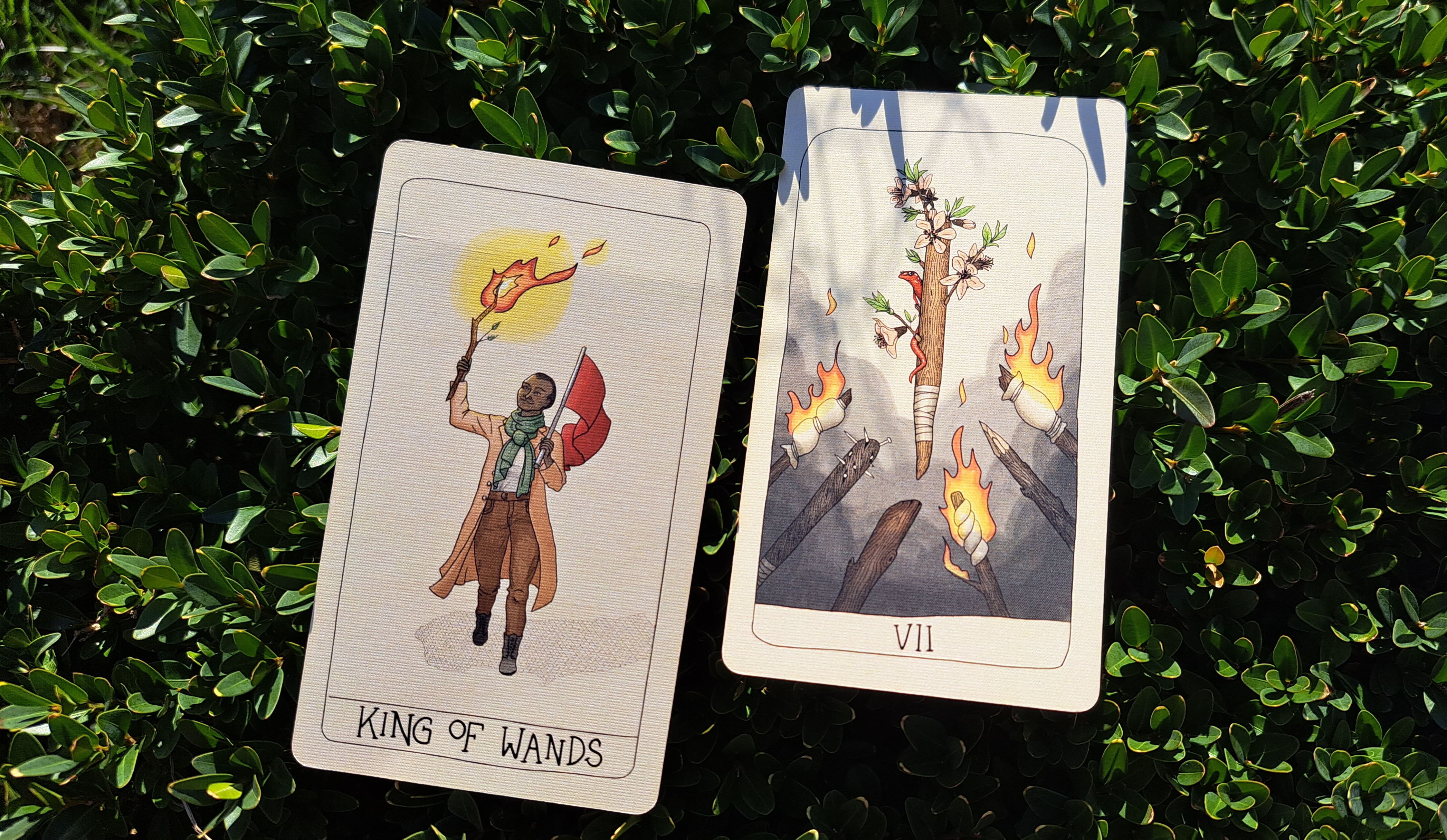 Le 2 de bâtons te demande d’être présent.e pour le seuil en tant que portail merveilleux capable d’élargir ta vision. Avec le 8, il te demande de faire de la place à tes impulsions et à ton envie d’agir rapidement, sans toutefois y céder, de les comprendre sans les laisser t’incendier. Avec le 5 de bâtons, il te demande aussi de créer de l’espace pour tes réticences – pas par autosabotage mais parce qu’elle gronde pour une raison. (Par exemple, prendre le temps de t’assurer que tu pourras te chauffer cet hiver, ce n’est pas de l’autosabotage). C’est le moment d’investiguer tes errances, tes dispersions, et aussi ta colère. Quels sont leurs messages ? Faut-il les libérer ou en faire des alliés puisqu’elles sont là pour durer ?