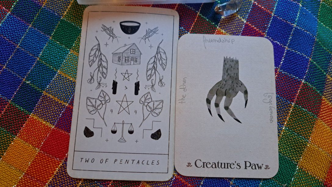 Centrer le tirage (par rapport à tout ce dont nous avons discuté par message vocal): 2 de pentacles (Hollow Valley) + Creature’s paw (literary witches)