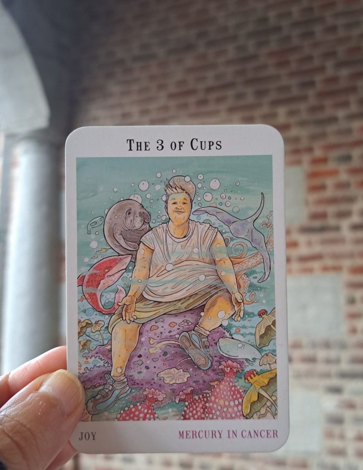 L’amour de soi a parfois mauvaise presse. Pourtant c’est ce qui me vient avec le 2 de coupes. Bien sûr, aspirer à toujours plus d’amour alors que la haine est partout, c’est un remède! L’amour inconditionnel dans des relations interpersonnelles, c’est souvent du bullshit pour amener à accepter l’abus. Vis-à-vis de soi-même, viser l’amour inconditionnel, ce serait pas au contraire l’antidote aux abus? Est-ce qu’on y parvient toujours? Non, bien sûr! Est-ce que ça peut rester un objectif? Je pense que oui… Si tu n’es pas d’accord avec moi, pourquoi ne pas journaller à ce sujet, faire le point sur ce que ça réveille en toi, réfléchir à tes arguments? Le tout dans la douceur radicale! C’est quand même le 2 de coupes qui regarde vers le 10 de coupes hein, si c’est pas des cartes remplies de tendresse ça?!