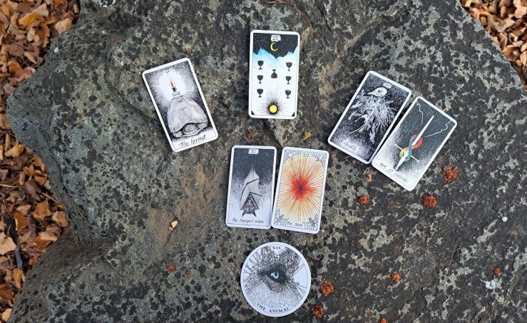 passé: ermite / présent: 7 de coupes – ce qui floute/obstrue la vision: pendue – lâcher du leste sur le processus: soleil / futur: la mort + as d’épées / the animal