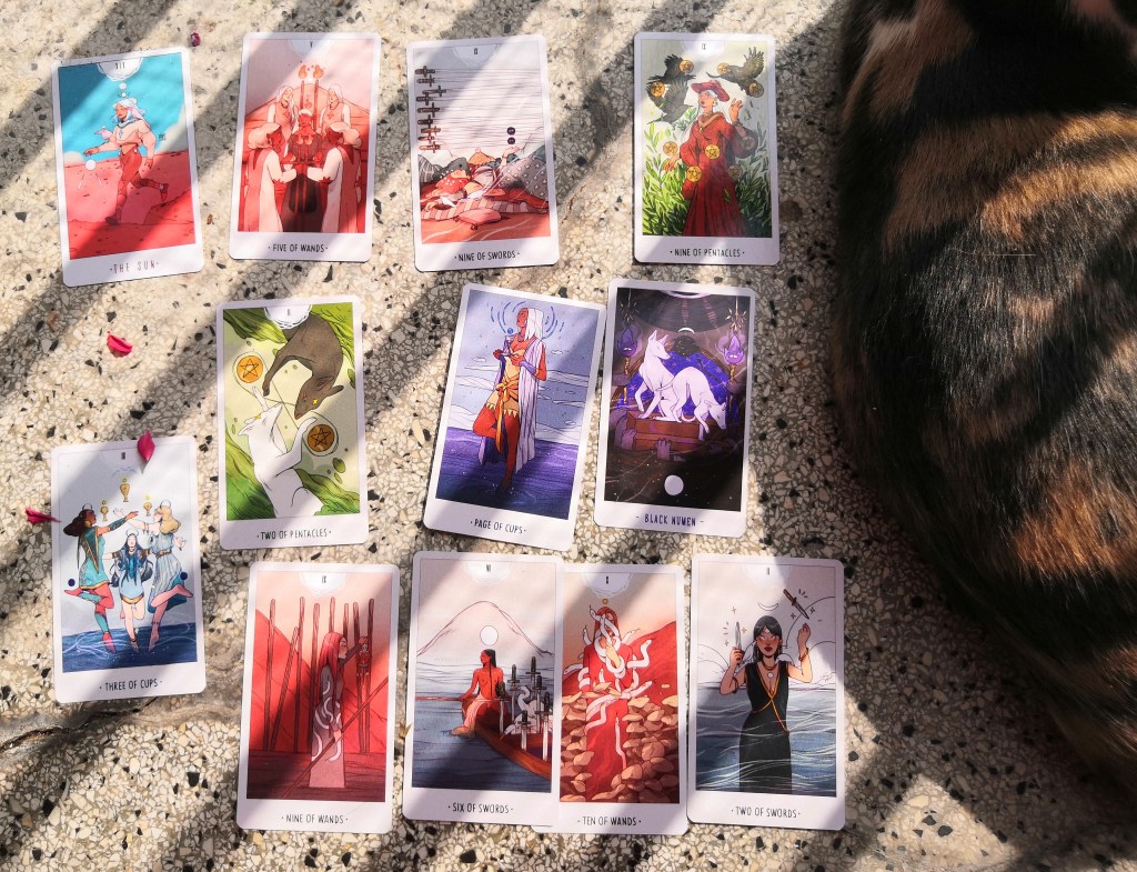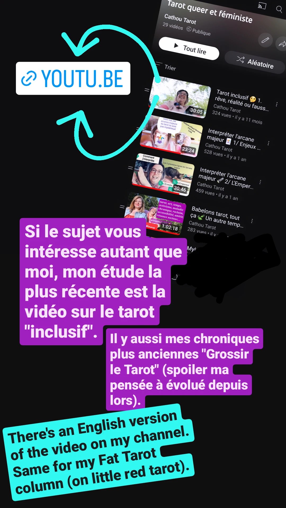 Mais ça n’était pas mon objectif en créant mon blog, alors « en chariot dans l’univers du tarot », en 2016. Ça ne l’est pas plus maintenant. Mon objectif – si j’y arrive un tout petit peu c’est déjà ça – est d’apporter quelque chose aux gens qui voient déjà tout ça, les gens pour qui ça s’inscrit dans la chair, les gens qui vivent l’exclusion au quotidien et qui pensent pas que « l’éveil spirituel » seul va changer toutes les structures matérielles de leur oppression, les gens que les outils d’émancipation laissent sur le carreau. Apporter des mots, du réconfort, de la solidarité, la certitude de ne pas être seul-e.