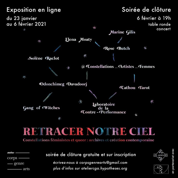 Cette promenade au firmament répond à l’invitation de l’équipe de l’Atelier Corps, genre, arts de l’association EFiGiES. Celle-ci organise soirée de clôture Retracer notre ciel: archives, constellations queer et création contemporaine ainsi qu’une expo virtuelle publiée sur son carnet de recherche de janvier à février 2021. Cette initiative est le prolongement du colloque Constellations créatrices: Héritages et réseaux féminins / queer organisé par les Jaseuses.
