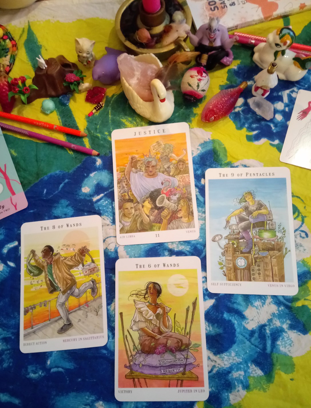 C’est qu’il existe une vision binaire qui se manifeste dans le tarot et dans de nombreuses pratiques spirituelles par un amalgame entre le féminin (et dans le pire des cas les femmes) et la passivité, la réceptivité, le soin, la douceur et puis le masculin (et dans le pire des cas les hommes) et l’action, le leadership, la prise de décision, etc. Cette distinction prend sa source dans (et continue d’alimenter) le patriarcat et l’hétéronormativité.