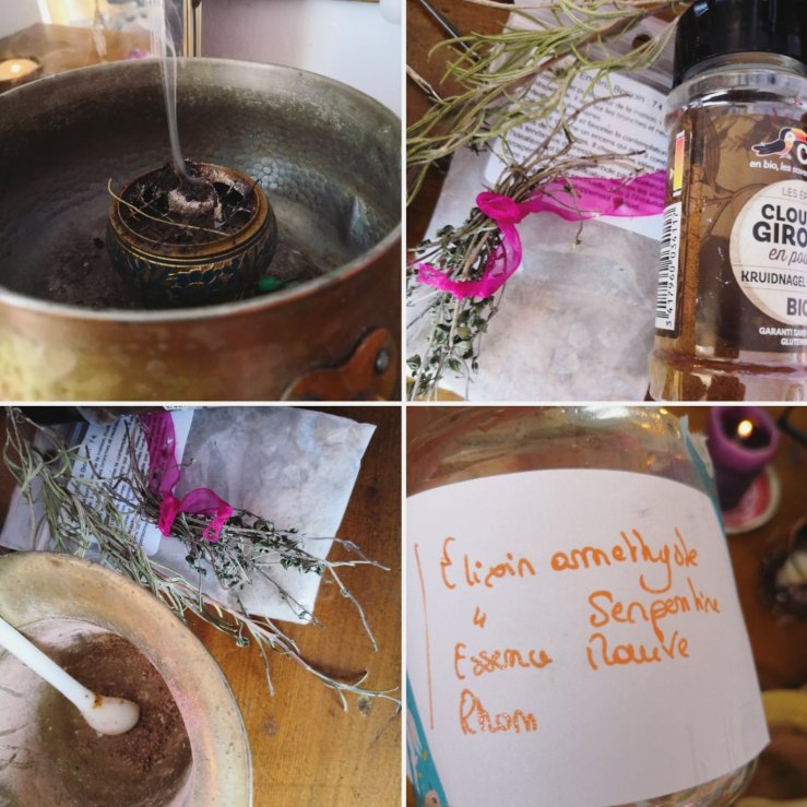 De retour de mon séjour à la campagne, j’avais besoin de réinvestir les lieux et faire de la place à ce qui me plaît. J’ai fait un mélange benjoin, clou de girofle ainsi que thym et romarin de mon balcon. Je ne l’ai pas chargé ni rien. Et je l’ai brûlé en mettant de l’ordre (c’est-à-dire en m’effondrant en sanglot) autour de mon espace sacré. Quant à mon élixir conçu pour nettoyer l’autel…. Je n’ai rien fait dans les règles de l’art, mais j’y ai mis mes intentions et j’ai apporté quelque chose. « essence » de mauve + « élixir » de pierres (améthyste et serpentine) + rhum pour un semblant de conservation de ce nid à bactéries (et en tout cas pour avoir l’impression de nettoyer l’espace).