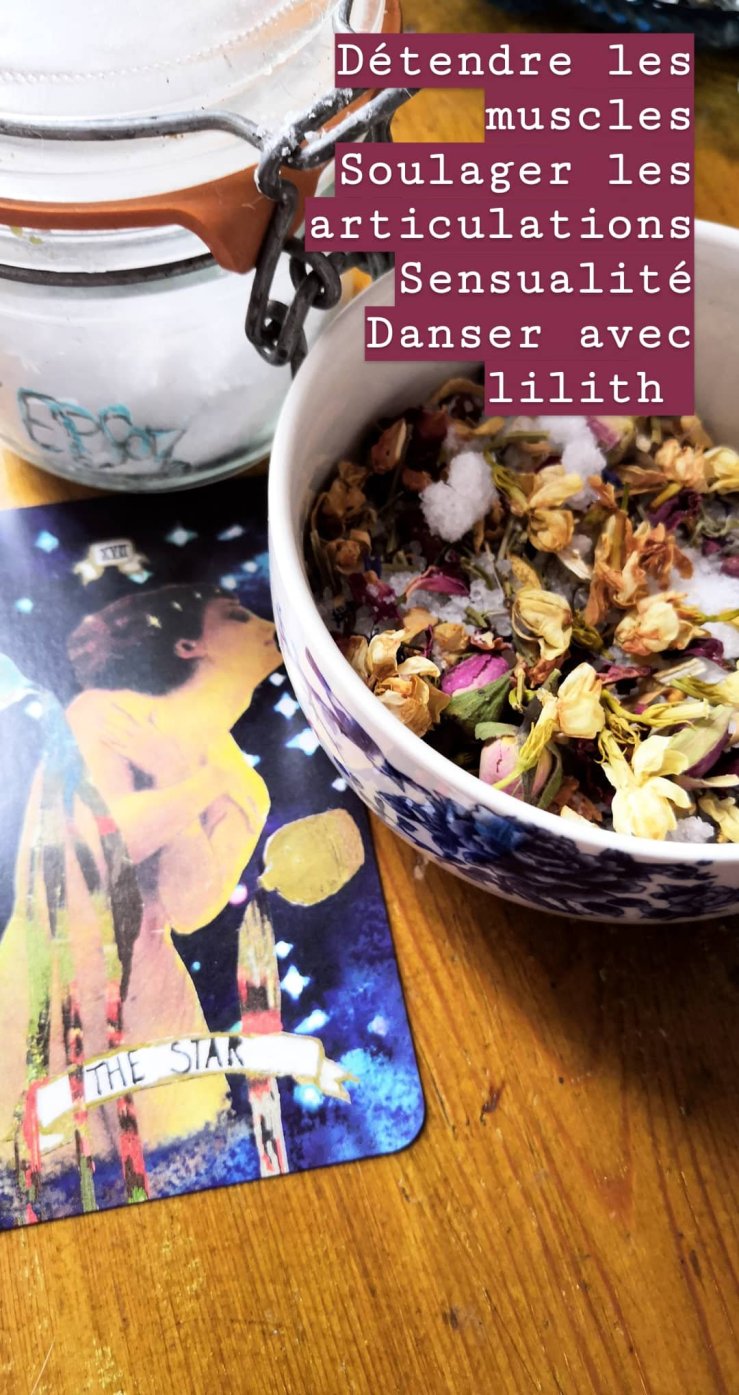 J’ai un mélange d’herbes que j’associe à la déesse Lilith et à la « sexualité sacrée ». J’ai écrit un petit poème en me baignant avec lui, tu as déjà pu le constater. Simple, je le répète en flottant dans le bain pour m’en imprégner.