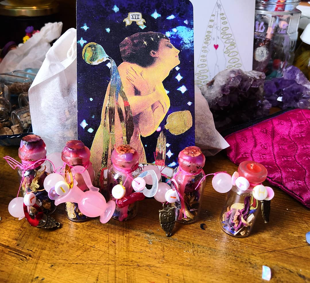 Les fioles: toutes les plantes, des pierres puis scellées à la cire avec des petites bougies d’anniversaire (le bon plan pour ne pas gaspiller) roses, rouges et violettes. Je leur ai attaché un fil rose avec du quartz rose, une breloque que j’associe à Lilith/au thème, des sequins et les lettres L-I-L-I-TH réparties sur chacune des fioles. 🌟