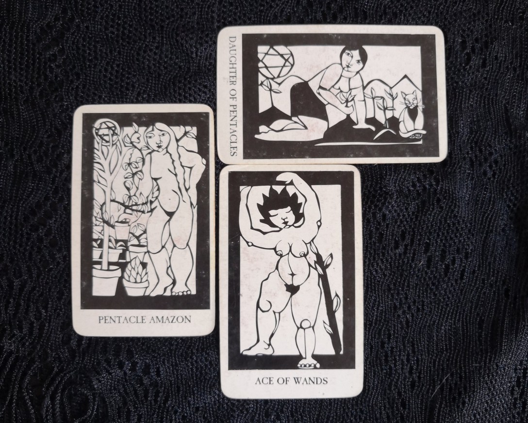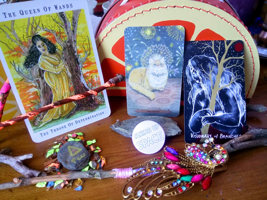 Je puise des pistes de réponse dans la joie que m’inspirent certaines représentations dans un tarot. Quand j’ai découvert la Reine de bâtons du Next World Tarot, grandiosement queer, affirmant son espace, occupant sa scène, j’ai bien failli pleurer. Elle illumine. Il y a de la célébration. Il y a du dynamisme. Il y a du charisme. La drag queen grosse qu’elle était déjà dans mon esprit prend vie. Dans le contexte de représentations diverses, comme avec le Next World Tarot, nous ne sommes plus assigné-e-s à des rôles limités. Voilà donc que la tristesse des personnes grosses devient légitime, sans caricature. Ainsi, il n’est ainsi pas question d’un-e nième gros-se mal dans sa peau sur le 5 de coupes. Le mal-être n’est pas une fatalité. Mais il existe. On a droit à un éventail de représentations. Les tropes habituels sont évités. Les gros-ses vivent sous les pinceaux de Cristy C. Road. Lire la suite « Grossir le tarot / Porter le regard par-delà les métaphores (2e partie) »