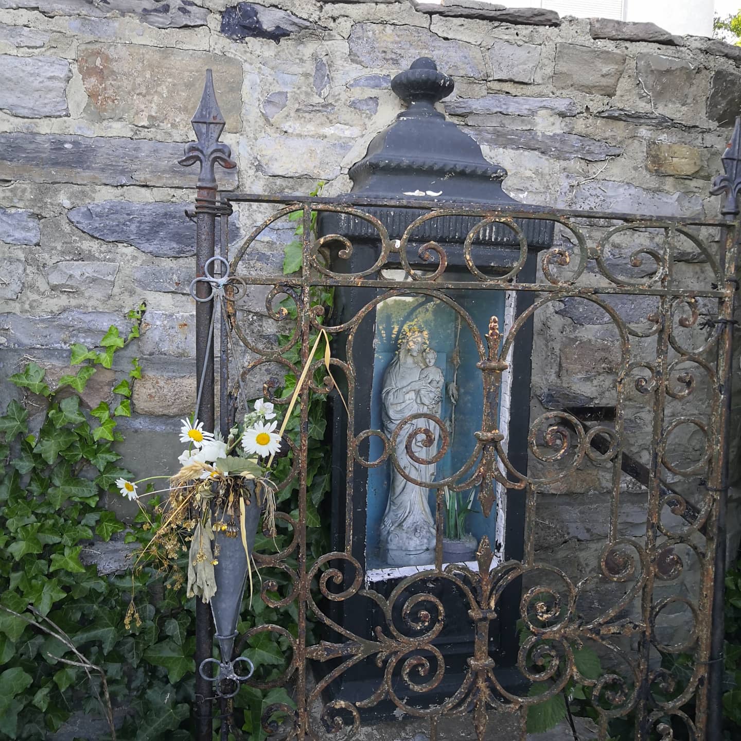 Je m’égare… N’est-ce pas le propre d’une pélerine ? C’est d’ailleurs au fil de mes errances que je tisse des histoires du Mont Minerve. Il y a 10 jours, dans l’église du Mont Minerve, une nouvelle statue avait été posée sur l’autel de la Vierge vêtue d’une tenue visiblement antérieure aux années 1920. Quand je me suis enquis de son origine, la concierge qui venait fermer le bâtiment a déclaré qu’elle était « apparue » à l’arrière de l’église et qu’elle l’avait déposée à cet endroit en attendant le retour du chanoine. Je m’égare ; des fragments apparaissent. Ce n’est qu’en m’égarant que mes pas – ou ses envoûtements – me mèneront à la source sacrée du Mont qui m’apparait parfois en rêve depuis des années.